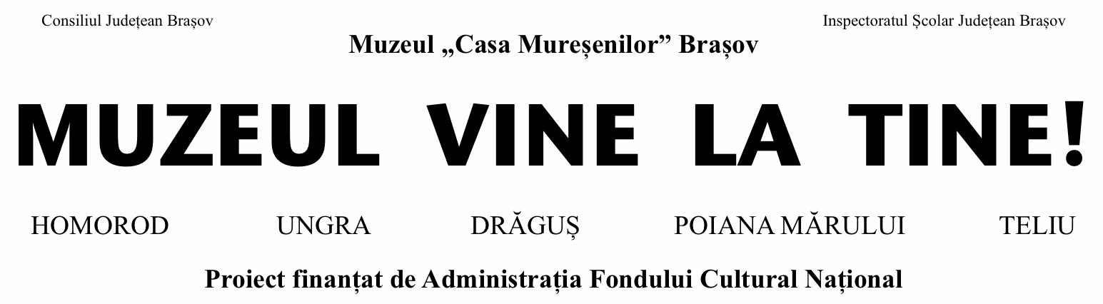 Proiectul "Muzeul vine la tine!" este desfăşurat de Muzeul "Casa Mureşenilor" Braşov cu finanţare din partea Administraţiei Fondului Cultural Naţional şi cu sprijinul partenerilor săi: Inspectoratul Şcolar al Judeţului Braşov, Şcoala Generală Homorod, Şcoala Generală Ungra, Şcoala Generală Drăguş, Şcoala Generală Poiana Mărului, Şcoala Generală Teliu.